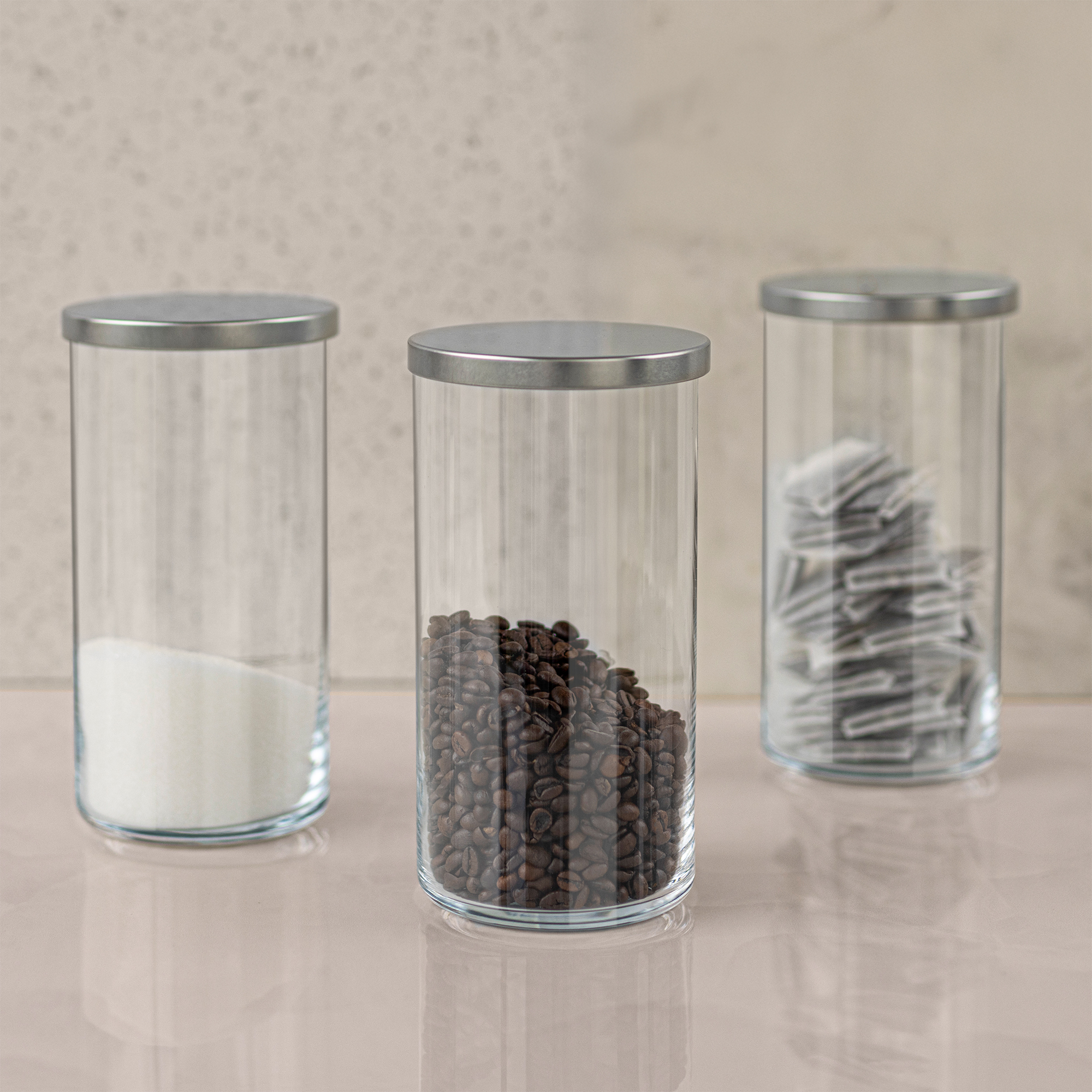 Smukły korpus ułatwia ustawienie pojemnika w rzędzie lub szufladzie. Metalowa pokrywka dodaje industrialnego charakteru i chroni zawartość przed kurzem i wilgocią. Szkło jest neutralne, łatwe do utrzymania w czystości i dobrze eksponuje przechowywane produkty.